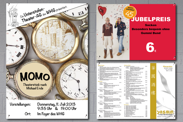 Printprodukte im Kleinformat bis DIN A3 sind z.B. Broschüren, Flyer, Briefpapier, Visitenkarten, Poster, Urkunden, Etiketten, Grußkarten, Schilder etc.